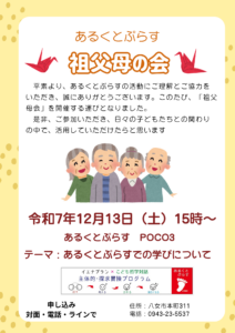 祖父母会のご報告 令和7年12月13日(土)あるくとぷらすにて開催しました。 5名の祖父母様に、ご参加頂きました。始まりから、話しが尽きず、予定の時間を大幅に上回るほどでした。お孫さんへの深い愛情を感じました。同時に、親 […]